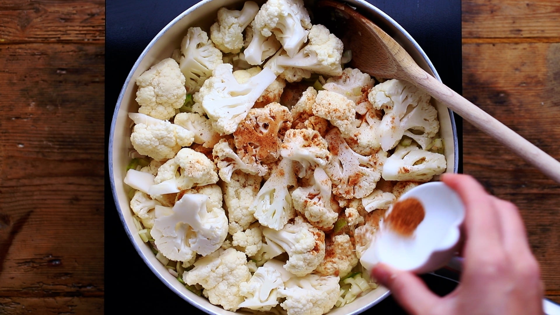- Next, add the cauliflower florets and half a teaspoon of ground nutmeg.