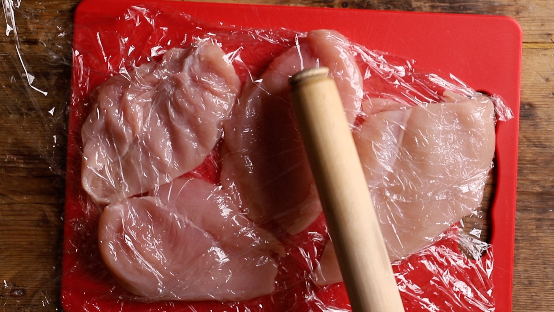 - First prepare the chicken: Place cling film under and over the chicken breasts and the bash with a rolling pin to flatten the meat to around half a cm in thickness.