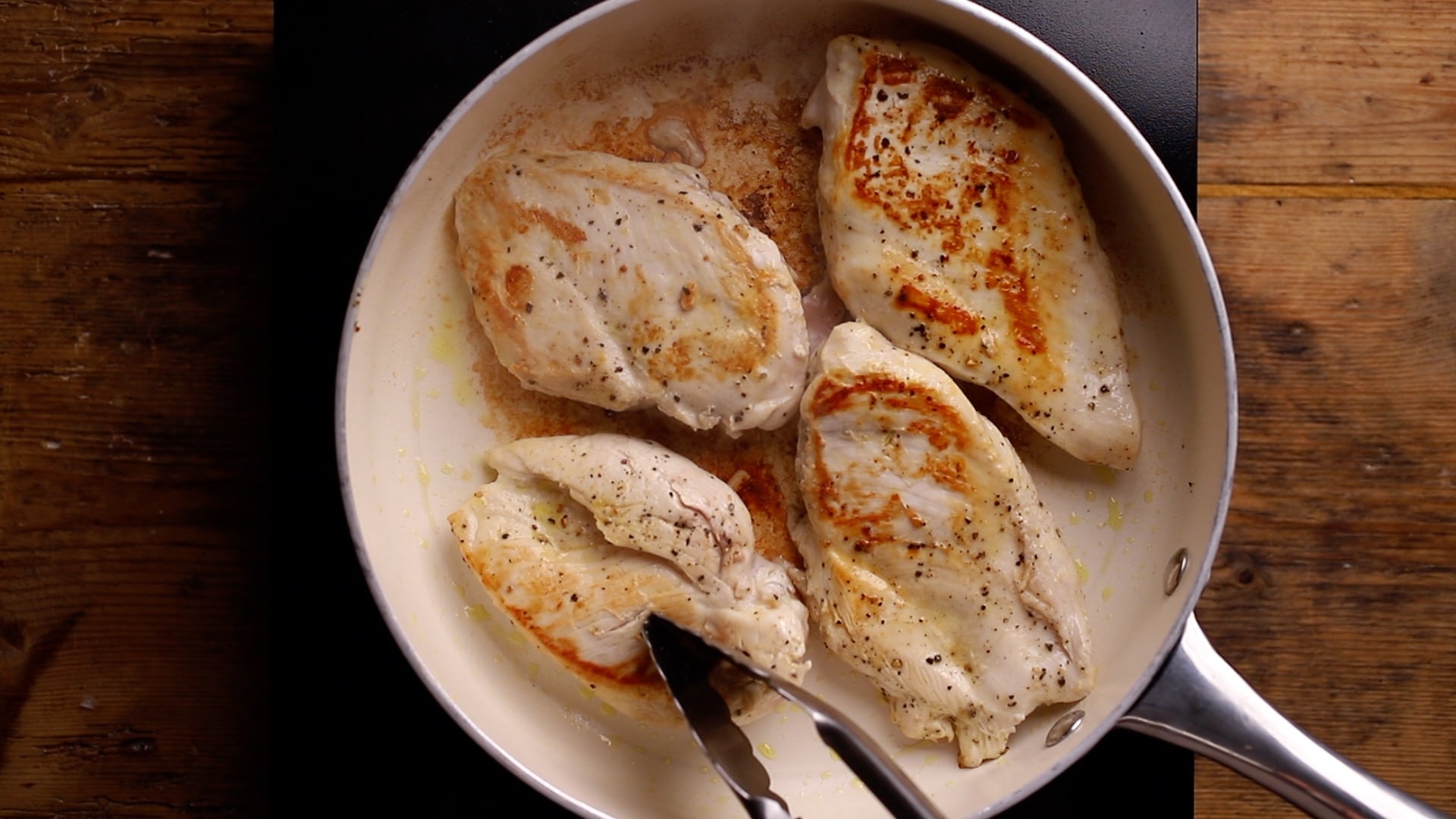 - Place a large frying pan on the heat and then add the chicken breasts. Cook on each side for 2-3 minutes or until golden brown. Then remove from the pan and set to one side.