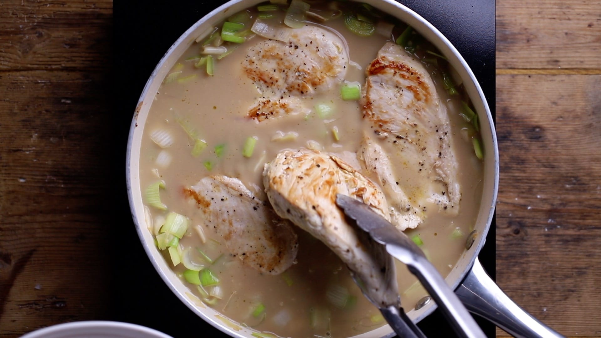 - When the broth starts to simmer return the chicken to the pan and cook with the lid on for 20 minutes.