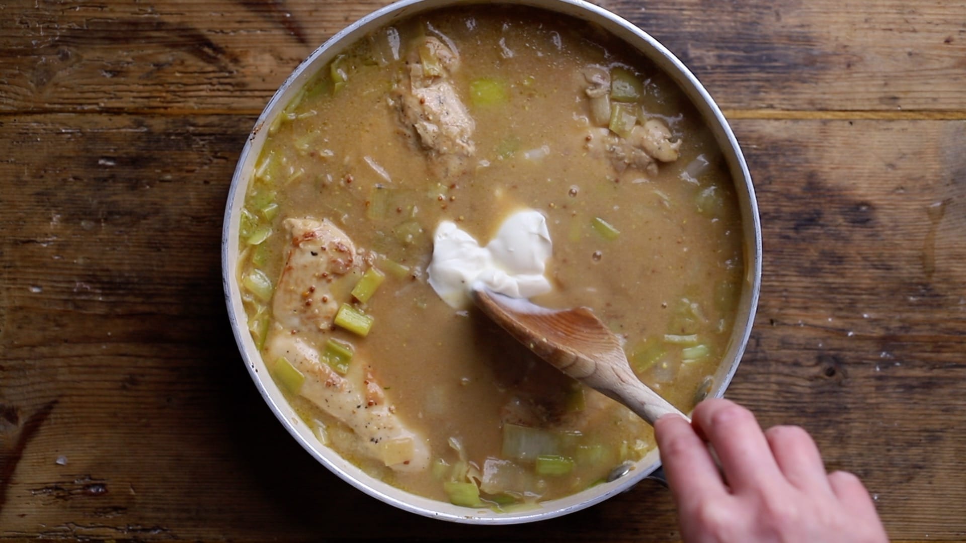 - After 20 minutes remove the lid and stir 1 teaspoon of wholegrain mustard and 3 tablespoon of creme fraiche into the chicken and leek broth.