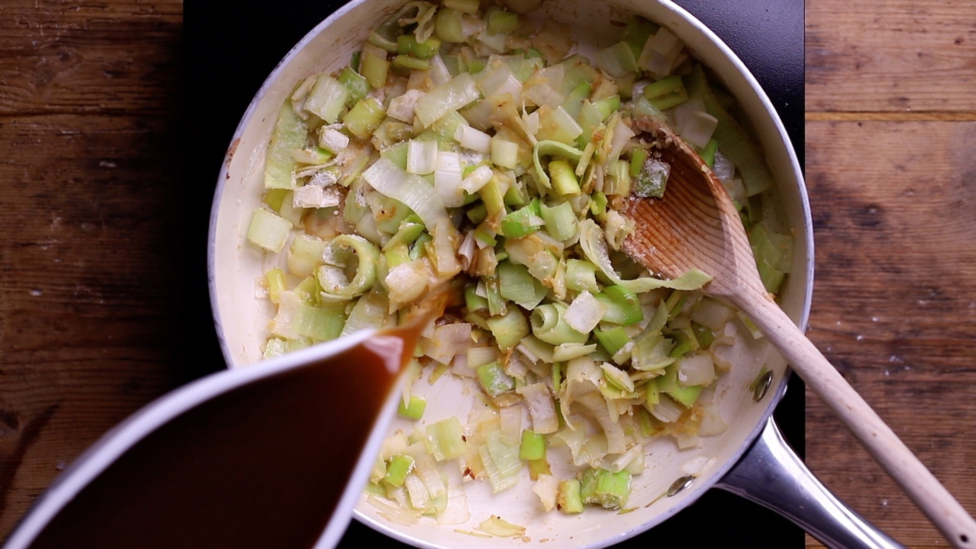 - Next prepare the chicken and leek broth: Using the same pan, add a little more oil and then gently fry the chopped leeks